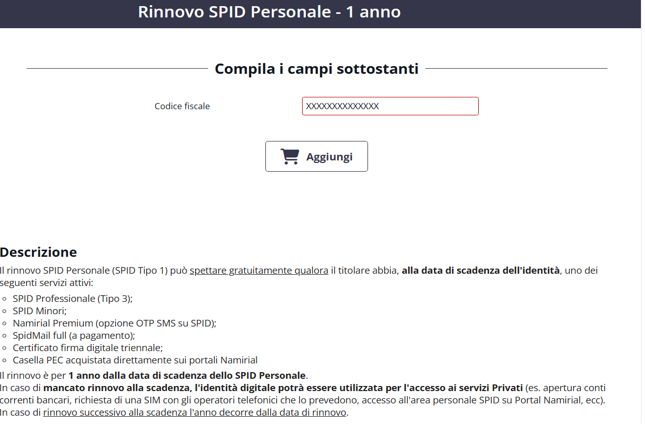 Si aprirà una pagina dove si dovrà inserire il codice fiscale dello spid da rinnovare e dove sarà riportata la descrizione