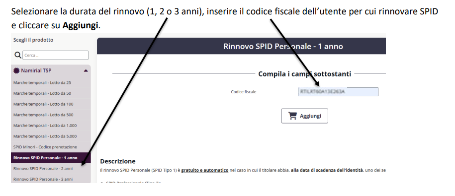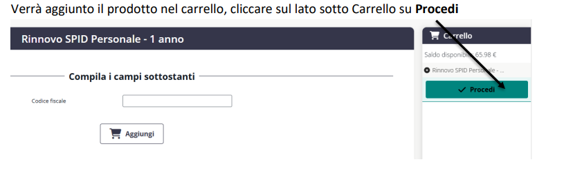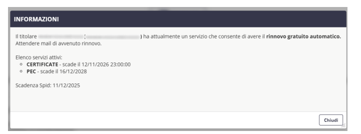 - Se il rinnovo di SPID è gratuito in quanto hanno un servizio attivo abilitante, nel momento in cui viene aggiunto al carrello appare il messaggio riportando l’elenco dei servizi e la relativa scadenza:
