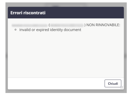 Se SPID è SOSPESO in quanto è scaduto il documento di identità, NON è possibile procedere con il rinnovo, l’utente dovrà prima procedere con l’aggiornamento del documento nella propria area personale. In questo caso, provando a rinnovare l’identità, apparirà il seguente messaggio: